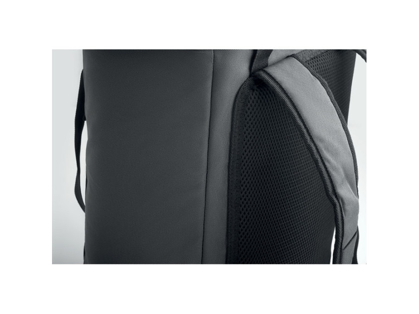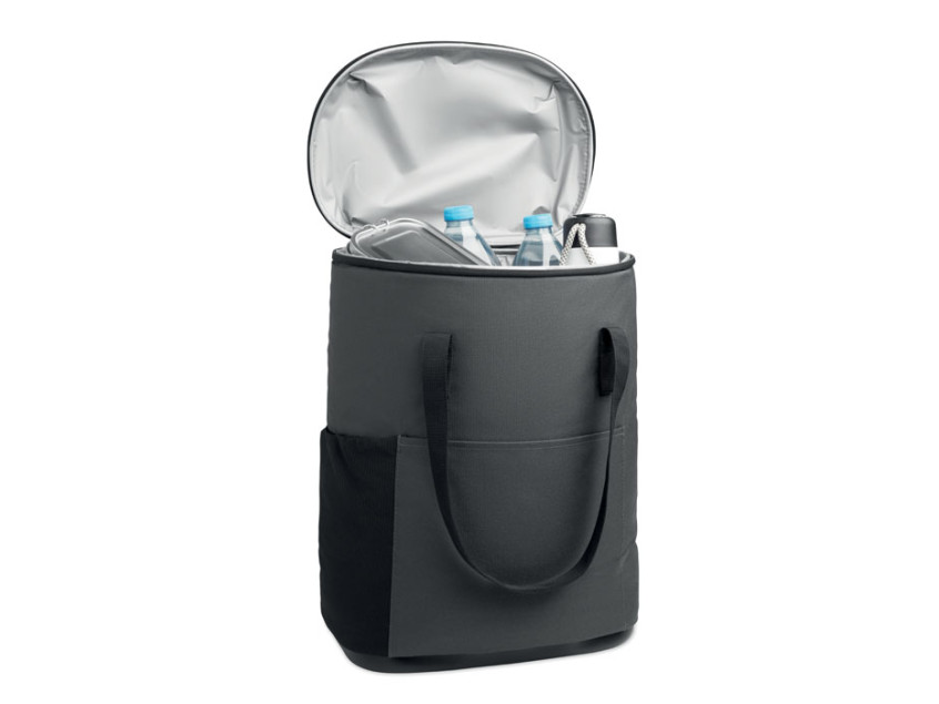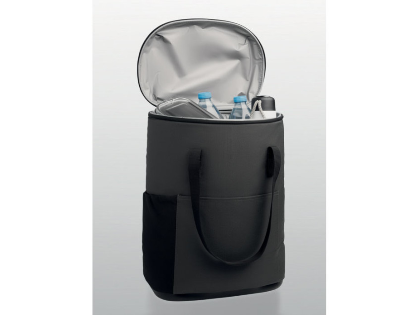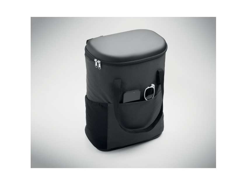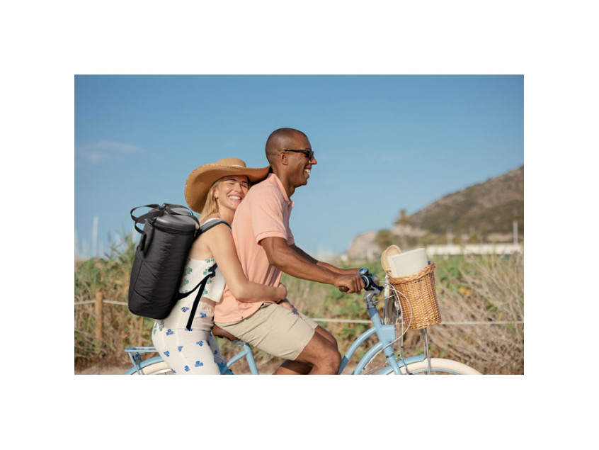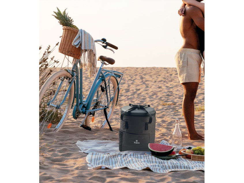 Рюкзак-кулер из водоотталкивающего полиэстера 600D с пенополиэтиленовой изоляцией и подкладкой из PEVA. Формованная крышка, мягкая сетчатая спинка, передний карман на молнии и боковые сетчатые карманы. Объем 20 л.