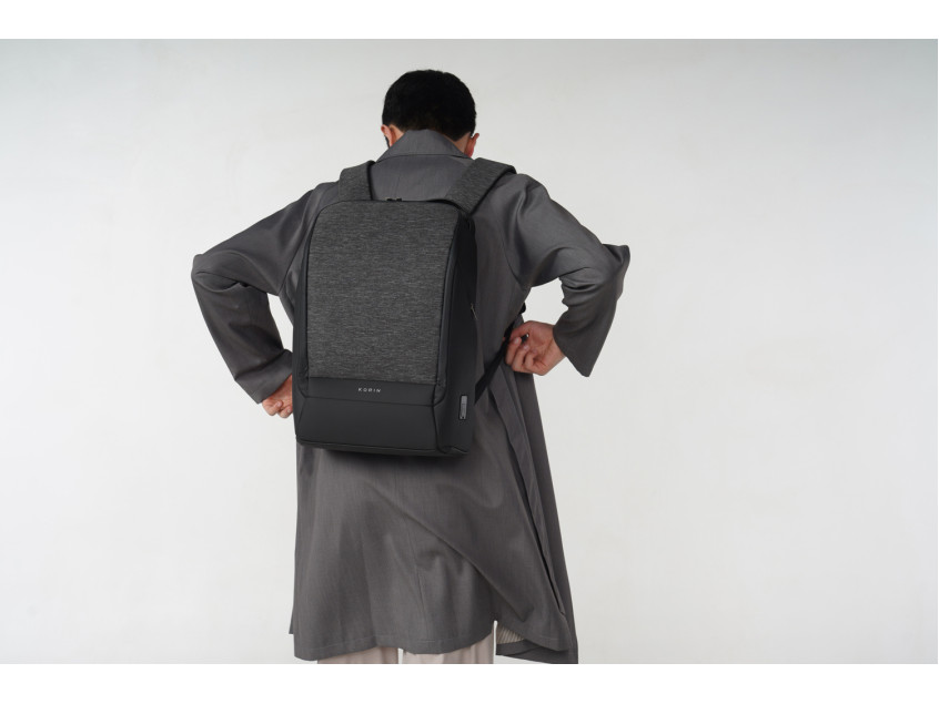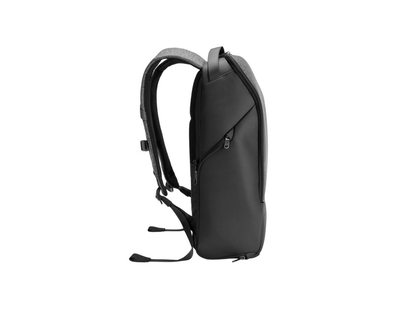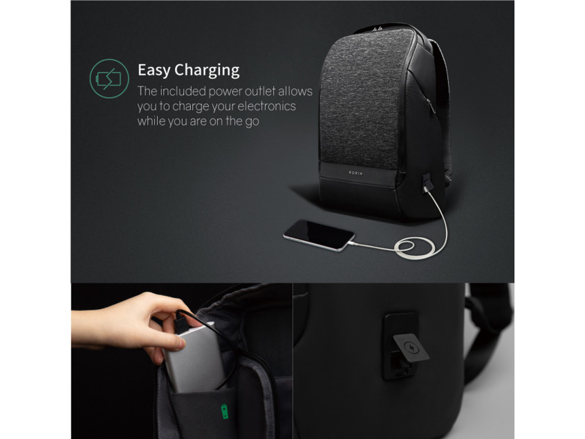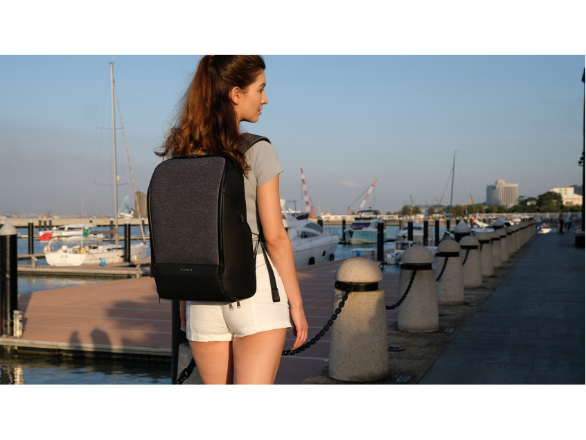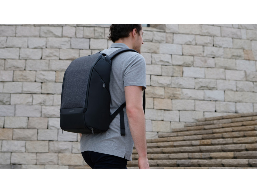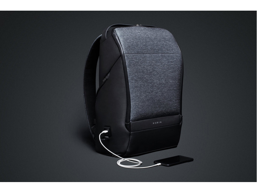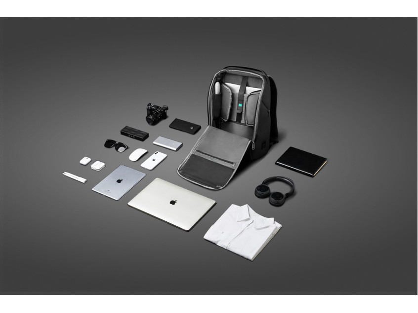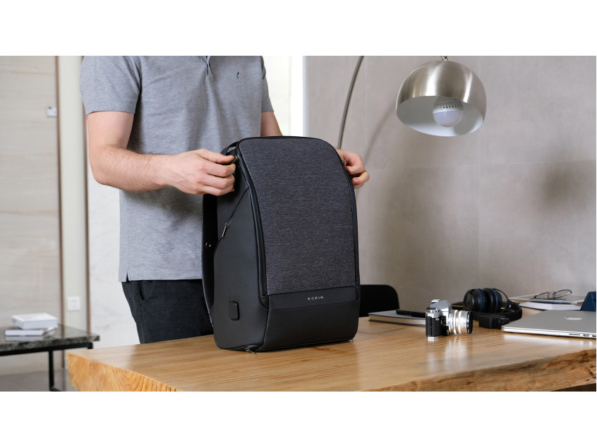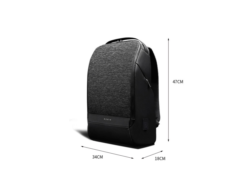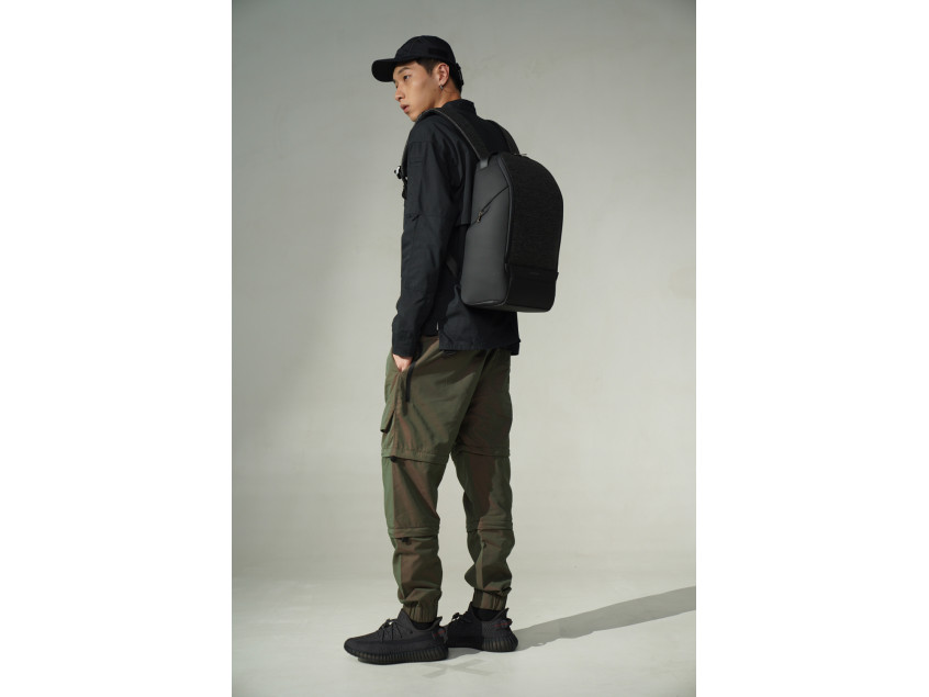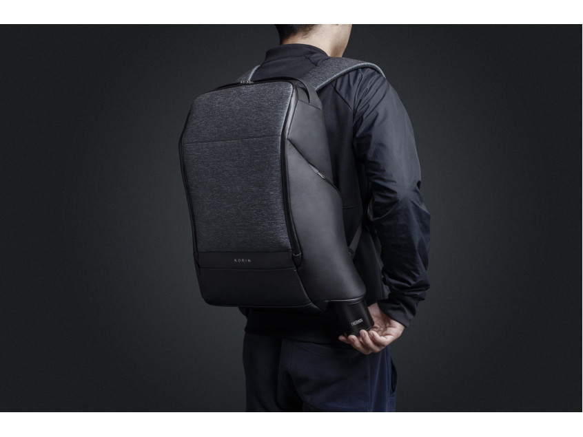 Вместительный водозащищенный рюкзак FlexPack Pro, обладатель премий iF Design Award 2019, Golden Pin Design Award, China Outstanding Industrial Design (CEID) Award, Governor Cup Industrial Design Excellence Award. Сделан из комбинации высокопрочных устойчивого к порезам и трению водоотталкивающих материалов: полиэстера и ткани многослойного плетения разных типов (нейлон, полиэстер и стекловолокно) черного цвета. Не требует специального ухода. Размер рюкзака 47х34х18 см, объем 18 л, вес 1330 гр. Рюкзак закрывается на водонепроницаемую молнию, которую можно зафиксировать с помощью кодового замка TSA007 с функцией таможенного досмотра. Конструкция рюкзака достаточно жесткая, не деформируется. Внутри рюкзака есть специальный карман, в который можно поместить powerbank, т к в него приходит USB-кабель (600 мм, 0,5-0,7 А, 5В), соединенный с портом на внешней стороне рюкзака для легкого подключения к смартфону. Это оригинальная запатентованная система зарядки K EasyCharging 1.0 с помощью USB-порта, расположенного в борту рюкзака, и кабеля, идущего к powerbank, что делает мобильную зарядку более удобной. По бокам рюкзака расположены 2 easy access кармана размером 22х12 см на водонепроницаемых молниях для термокружки, бутылки с водой, зонта, смартфона или других относительно небольших предметов. Детально продуманная организация отделений позволяет грамотно распределить вес. Самые тяжелые предметы располагаются ближе к спине, например, в отделении с мягким покрытием для ноутбука диагональю до 15,6”. Ноутбук надежно фиксируется и не перемещается при ходьбе. Внутри рюкзака есть 5 дополнительных карманов на молниях: 3 кармана 15-17х21-26 см и 2 боковых кармана с отделениями для телефона и мелочей 11,5х20 см. Специальная анатомическая конструкция вентилируемых мягких спинки и лямок и дополнительная поперечная лямка на магнитной застежке снижает нагрузку на плечи и спину, вес рюкзака воспринимается на 20-25% легче, чем при использовании стандартных моделей рюкзаков. На лямке специальная петля для очков или наушников. Сверху рюкзака есть удобная ручка из высококачественной прочной резины, за которую его можно нести или зафиксировать на ручке чемодана. Рюкзак оснащен стальным тросом, которым можно обхватить неподвижный предмет и затем зафиксировать в кодовом замке.