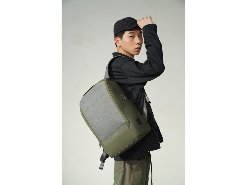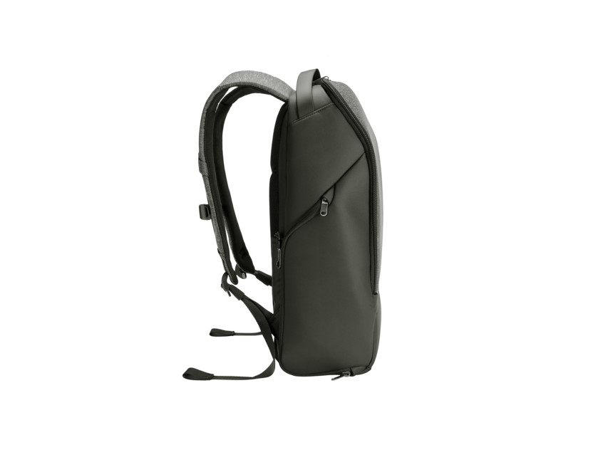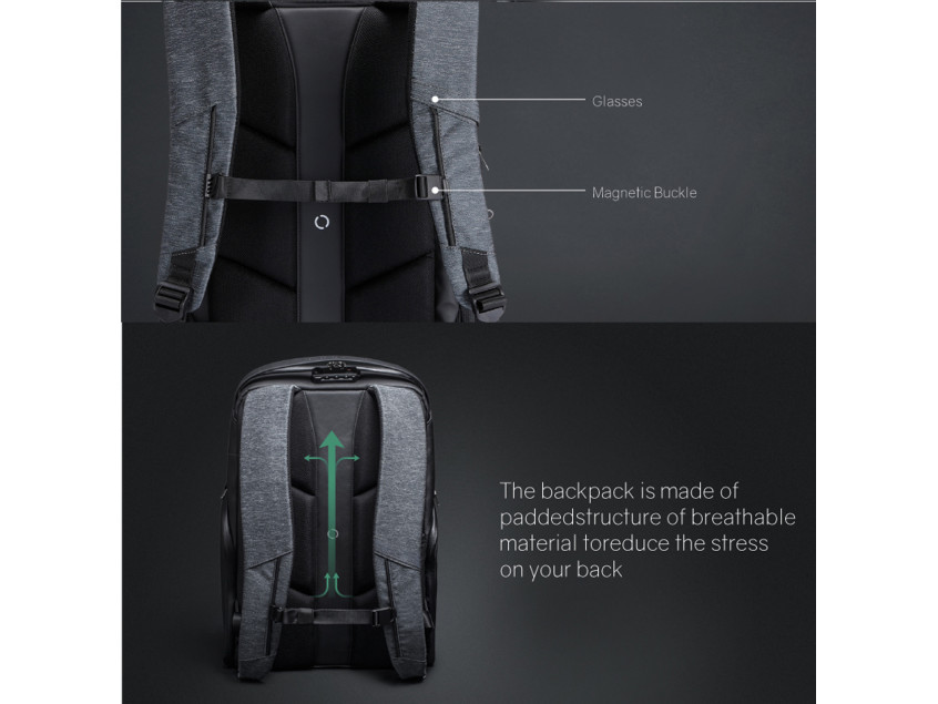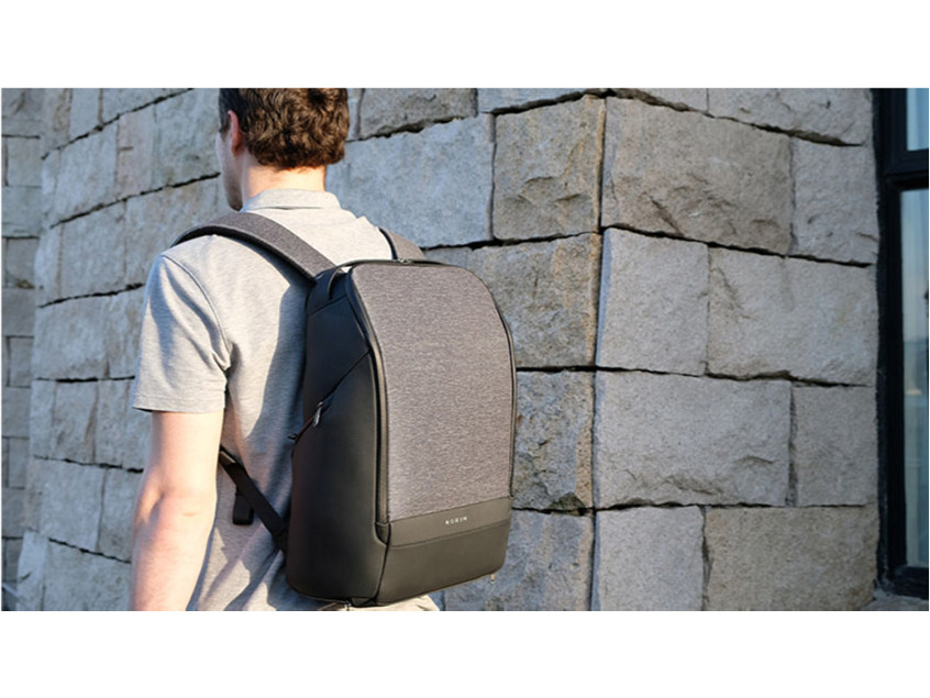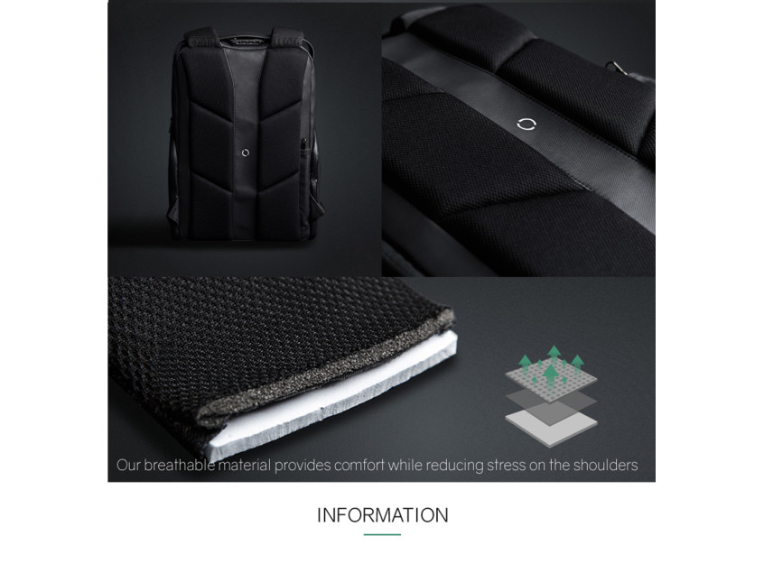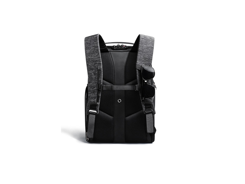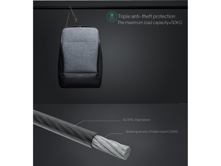 Вместительный водозащищенный рюкзак FlexPack Pro, обладатель премий iF Design Award 2019, Golden Pin Design Award, China Outstanding Industrial Design (CEID) Award, Governor Cup Industrial Design Excellence Award. Сделан из комбинации высокопрочных устойчивого к порезам и трению водоотталкивающих материалов: полиэстера и ткани многослойного плетения разных типов (нейлон, полиэстер и стекловолокно) черного и темно-серого цветов. Не требует специального ухода. Размер рюкзака 47х34х18 см, объем 18 л, вес 1330 гр. Рюкзак закрывается на водонепроницаемую молнию, которую можно зафиксировать с помощью кодового замка TSA007 с функцией таможенного досмотра. Конструкция рюкзака достаточно жесткая, не деформируется. Внутри рюкзака есть специальный карман, в который можно поместить powerbank, т к в него приходит USB-кабель (600 мм, 0,5-0,7 А, 5В), соединенный с портом на внешней стороне рюкзака для легкого подключения к смартфону. Это оригинальная запатентованная система зарядки K EasyCharging 1.0 с помощью USB-порта, расположенного в борту рюкзака, и кабеля, идущего к powerbank, что делает мобильную зарядку более удобной. По бокам рюкзака расположены 2 easy access кармана размером 22х12 см на водонепроницаемых молниях для термокружки, бутылки с водой, зонта, смартфона или других относительно небольших предметов. Детально продуманная организация отделений позволяет грамотно распределить вес. Самые тяжелые предметы располагаются ближе к спине, например, в отделении с мягким покрытием для ноутбука диагональю до 15,6”. Ноутбук надежно фиксируется и не перемещается при ходьбе. Внутри рюкзака есть 5 дополнительных карманов на молниях: 3 кармана 15-17х21-26 см и 2 боковых кармана с отделениями для телефона и мелочей 11,5х20 см. Специальная анатомическая конструкция вентилируемых мягких спинки и лямок и дополнительная поперечная лямка на магнитной застежке снижает нагрузку на плечи и спину, вес рюкзака воспринимается на 20-25% легче, чем при использовании стандартных моделей рюкзаков. На лямке специальная петля для очков или наушников. Сверху рюкзака есть удобная ручка из высококачественной прочной резины, за которую его можно нести или зафиксировать на ручке чемодана. Рюкзак оснащен стальным тросом, которым можно обхватить неподвижный предмет и затем зафиксировать в кодовом замке.