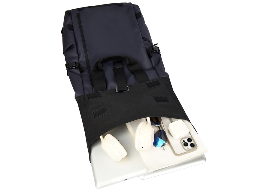 Первый, сверху - укреплённый пластиком край рюкзака фиксируется липучками-велькро и регулируемым по длине ремеём с металлической застёжкой с возможностью увеличкения и фиксации объёма на пяти уровнях,