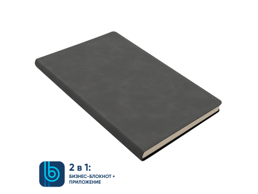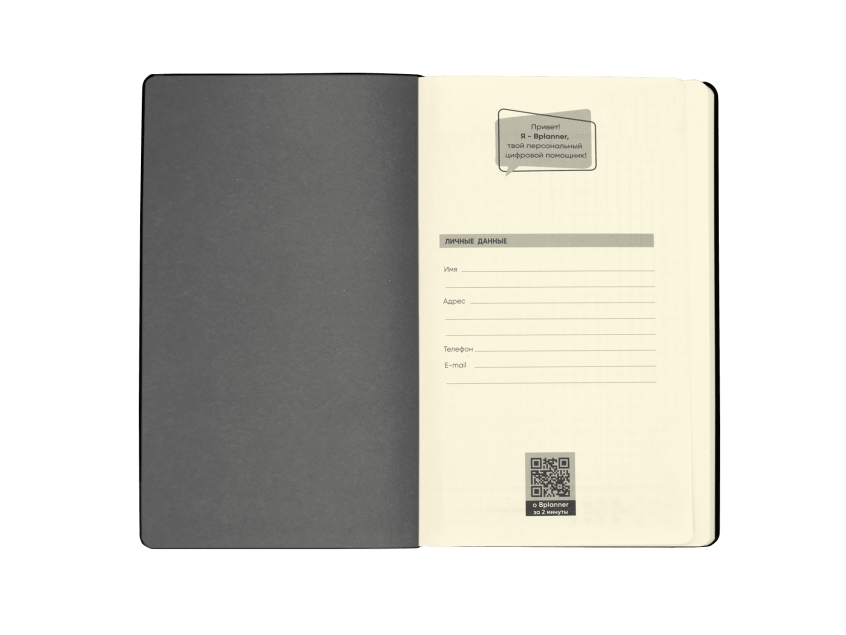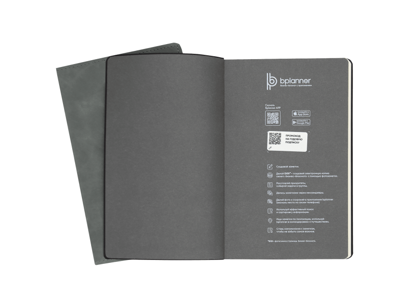 Бизнес-блокнот Bplanner. 05 —это бизнес-блокнот с недатированным тонированным блоком в клетку. Блок имеет ряд особенностей: наличие титульного листа с возможностью добавления личных данных и контактной информации, трекер воды и шагов на каждой странице и 3 разворота для заметок в конце блокнота. Обложка изготовлена из экокожи Nubuk-touch и имеет прострочку по краю в цвет материала. Фактура материала напоминает замшу или нубук. У блокнотов цветной форзац и нахзац. Блокнот подходит для УФ-печати и тиснения логотипа компании. На форзаце расположен qr-код, который активирует годовой доступ к мобильному приложению.