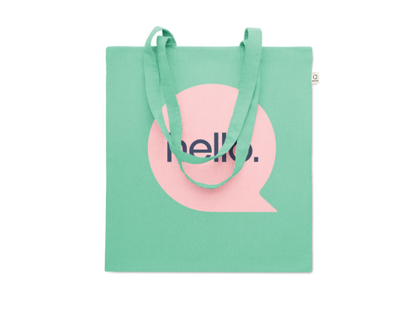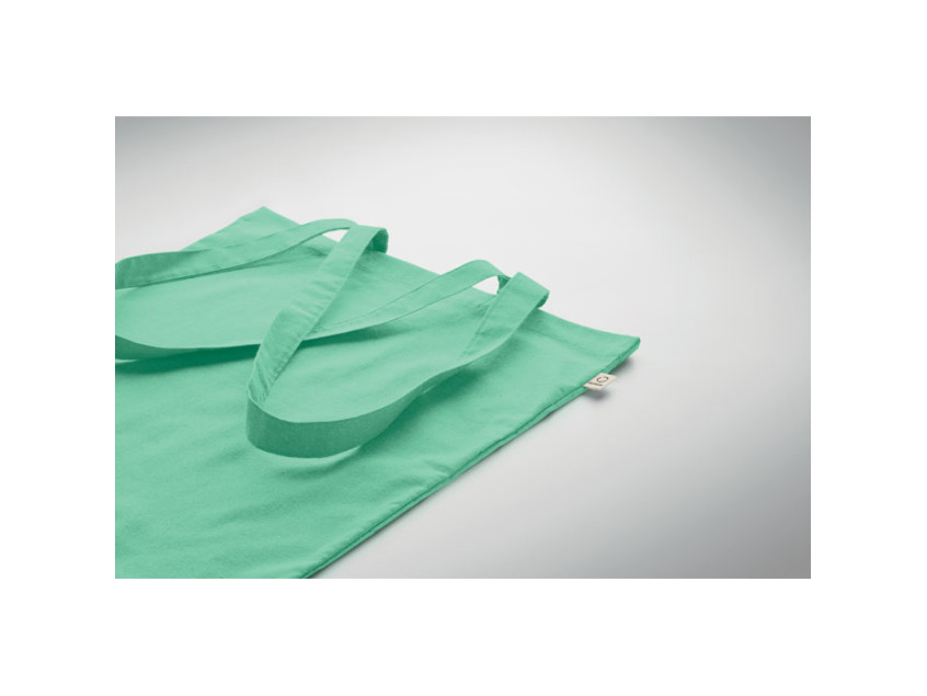 Сумка для покупок из переработанного хлопка (70%) и RPET(30%) с длинными ручками. 140 гр/м². Этот пункт может уменьшиться после впечатывания.