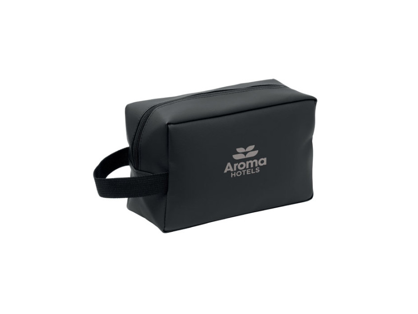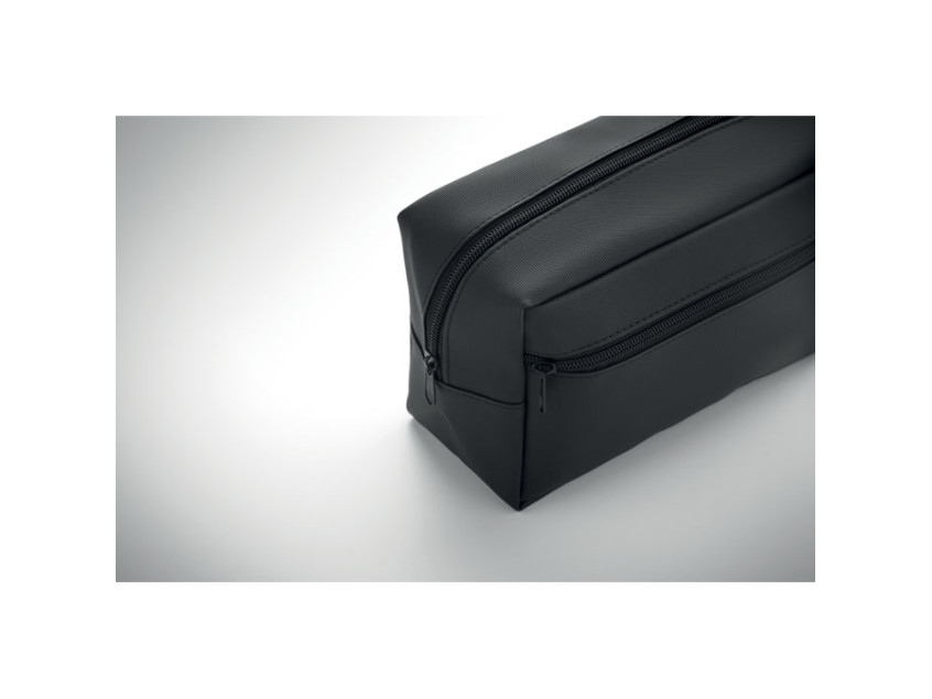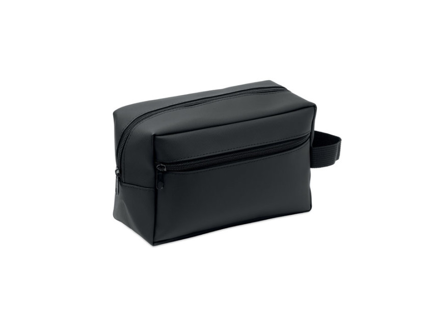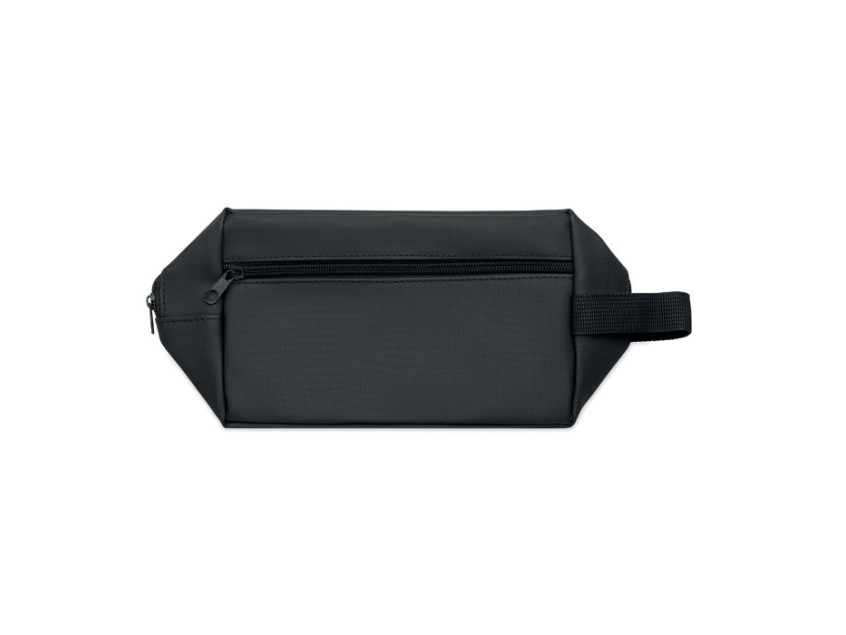 Косметичка из полиэстера RPET 600D с полиуретановым покрытием и подкладкой из RPET 210D. Имеет передний карман на молнии и ручку.
