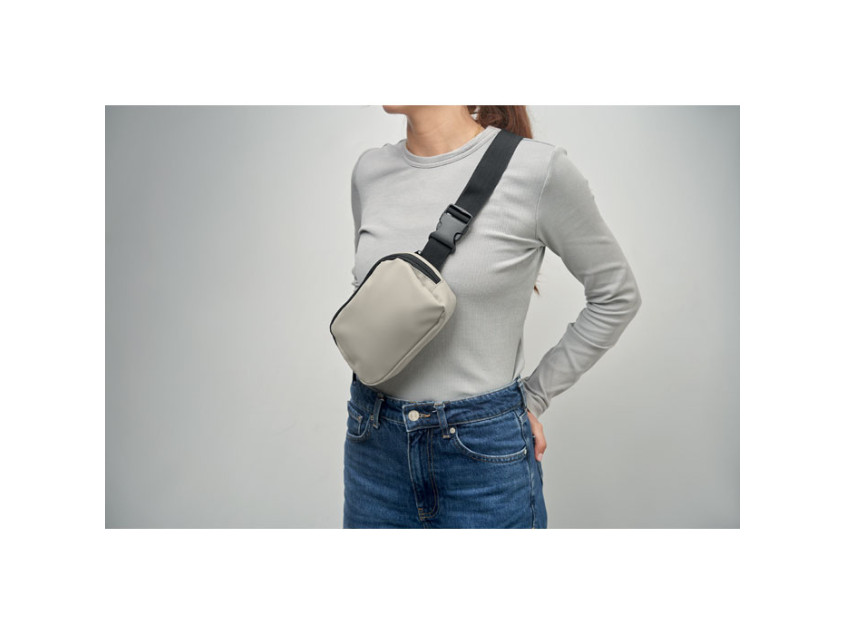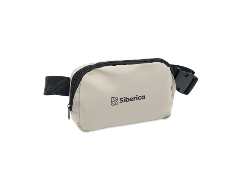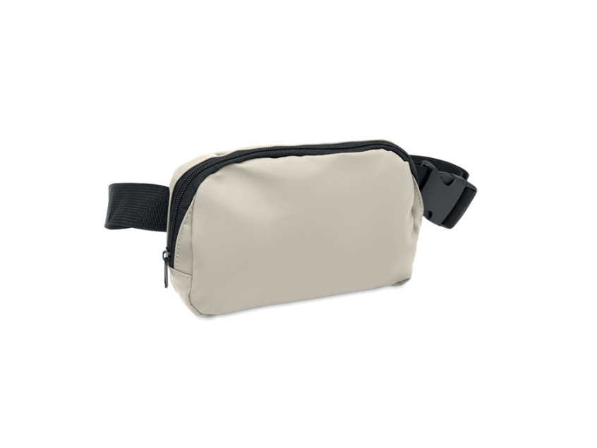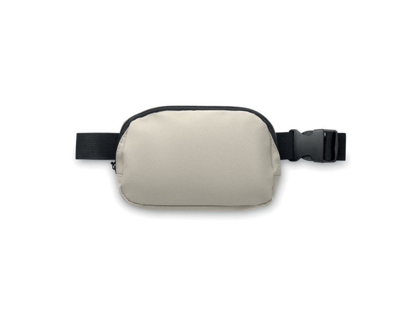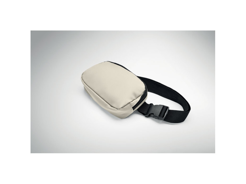 Waist bag or cross body bag in soft PU with 210D RPET polyester lining. 1 main zippered pocket, 1 back zippered pocket and mesh inside compartment.