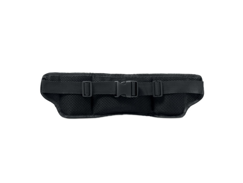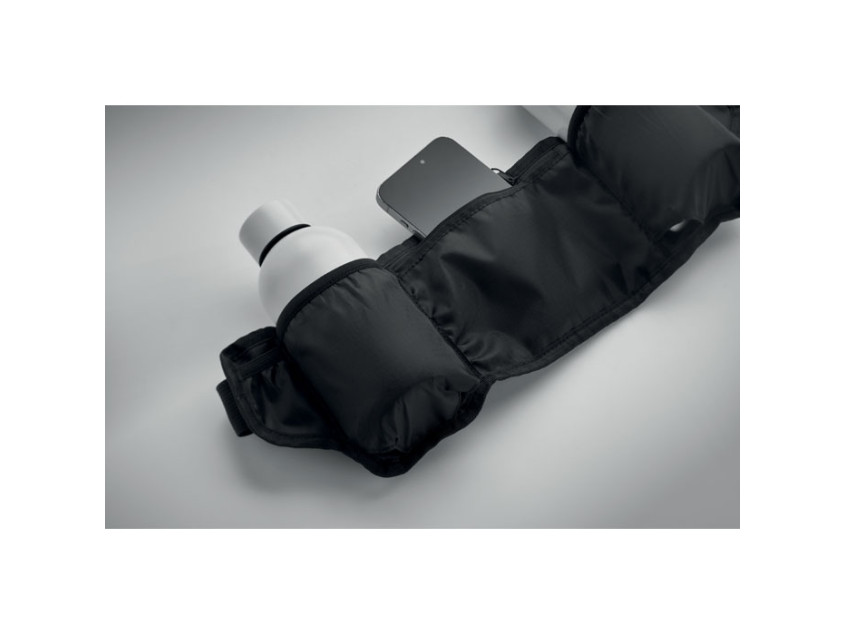 Спортивная поясная сумка из полиэстера 420D RPET с сетчатой задней частью. Имеет два отделения для бутылок, центральный карман на молнии и регулируемый ремень. Легкая и прочная.