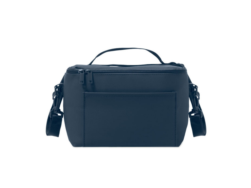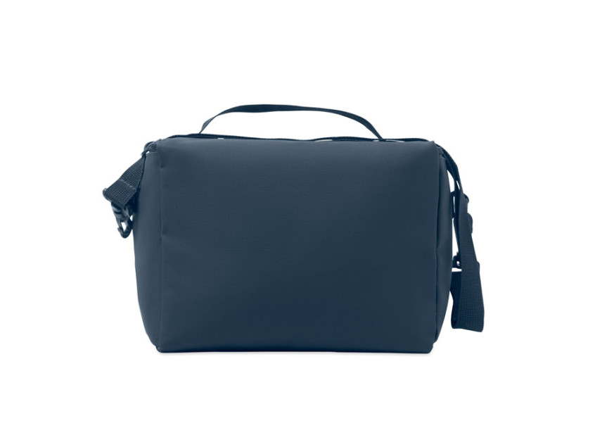 Термосумка из полиуретана с подкладкой из RPET 100 г. 1 передний карман, ручка и плечевой ремень. Изоляционная часть из пенополиэтилена и PEVA. Объем 5,5 л.