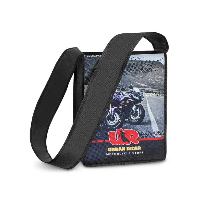 Удобная наплечная сумка-мессенджер с большой вместительностью. Подойдёт как альтернатива классических портфелей для выездных совещаний и других мероприятий. Донная складка позволяет разместить в необходимые документов или другие вещи, при этом позволяя компактно хранить сумку в сложенном виде. Брендирование производится полноцветной печатью в край с обеих сторон. На поверхности сумки можно разместить лого компании или выставки, а также полноразмерный принт любой сложности.
