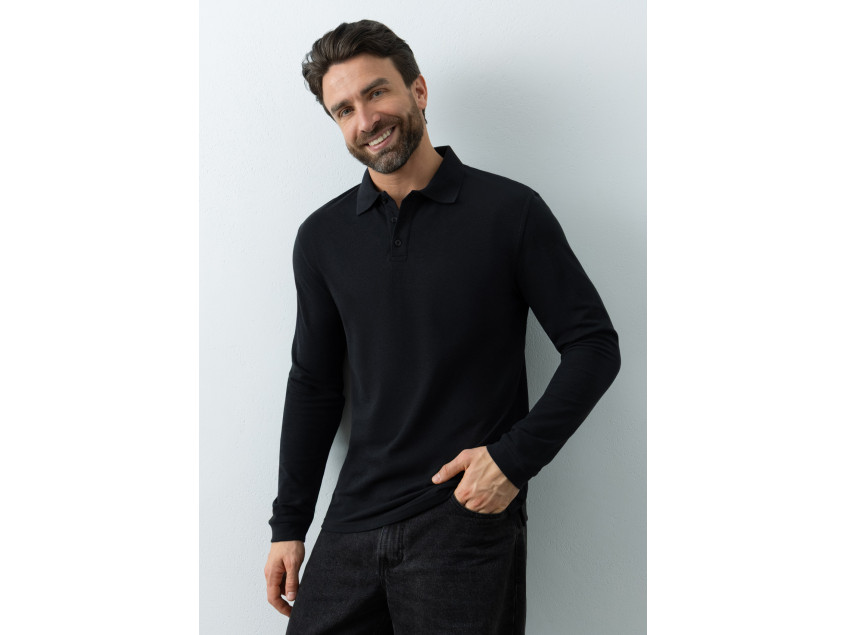 Мужское поло прямого силуэта с отложным, длинным втачным рукавом и застежкой на пуговицы. Манжет оформлен широкой эластичной резинкой в тон основному цвету.