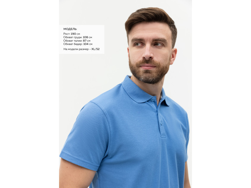 Поло выполнено из фактурной смесового ткани (65% хлопок, 35% полиэстер), благодаря чему изделие хорошо пропускает воздух и практически не мнется.