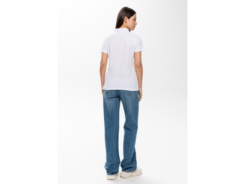 Женская рубашка поло приталенного силуэта с отложным воротником, втачным коротким рукавом и застежкой на пуговицы.