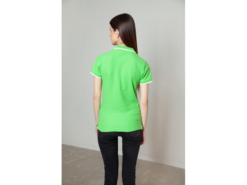 Женское поло приталенного силуэта с отложным воротником, втачным коротким рукавом и застежкой на пуговицы. Воротник и манжет выполнены контрастной резинкой.