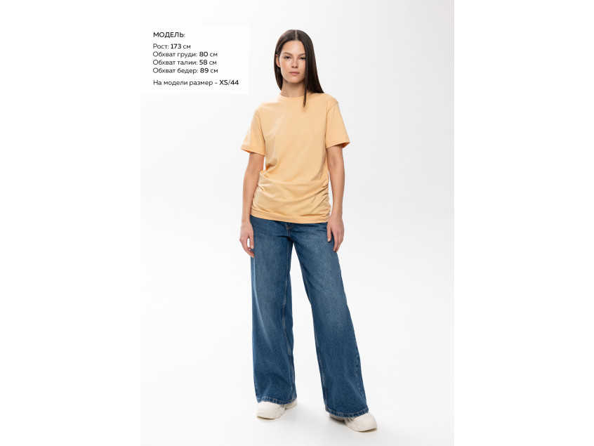 Размер женской футболки: XS/44. Параметры модели: рост 173 см.; обхват груди 80 см.; обхват талии 58 см.; обхват бедер 89 см.
