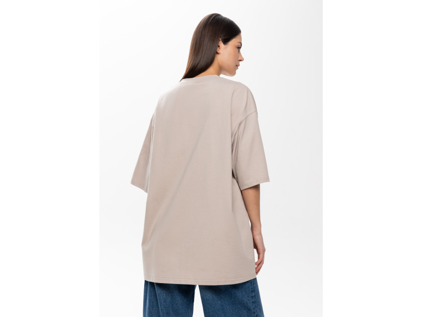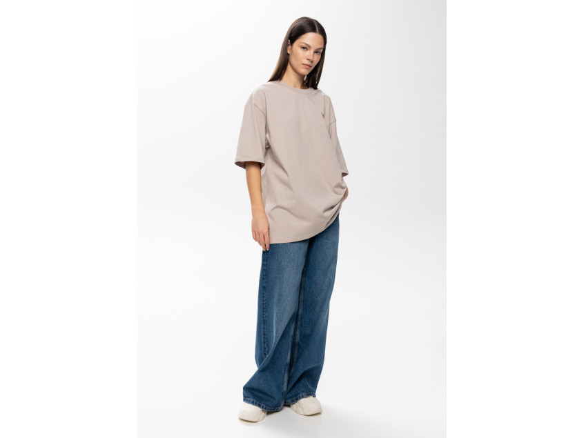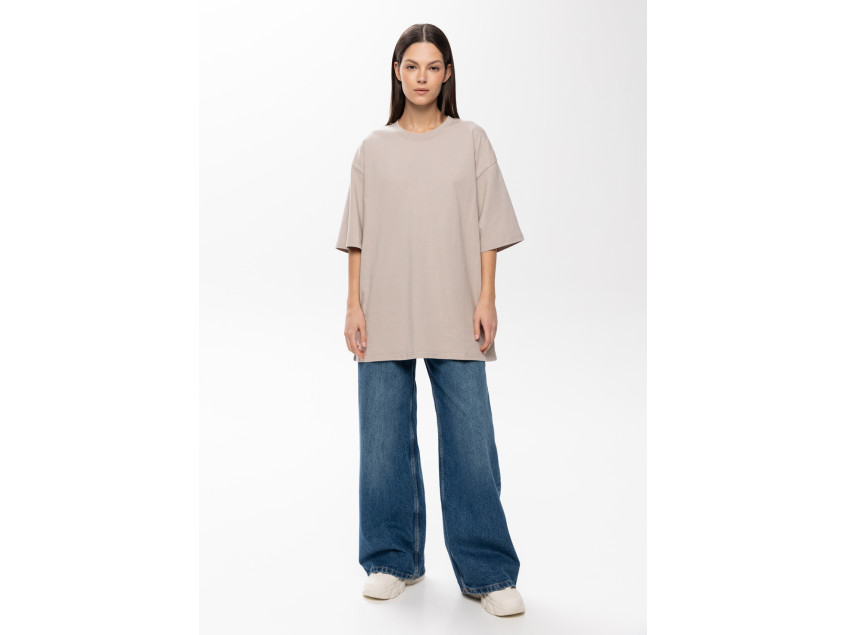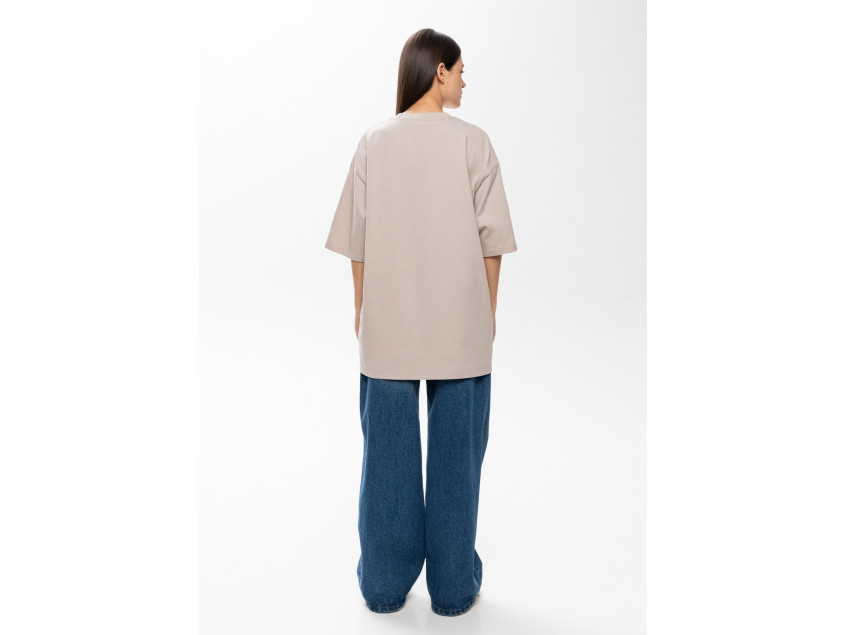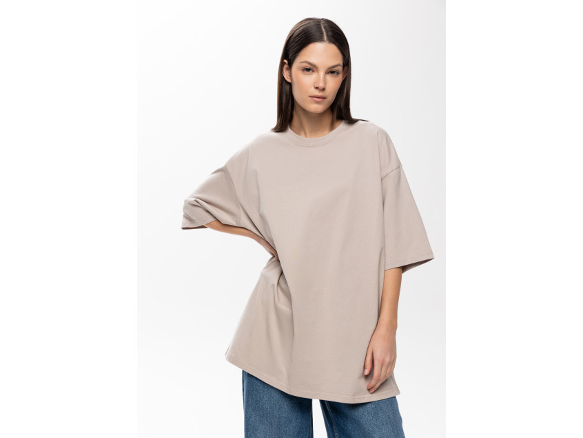Универсальная футболка силуэта-оверсайз с округлым воротом и спущенной линией плеча.