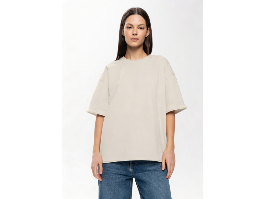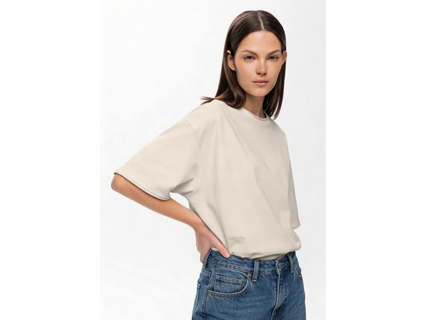 Футболка оверсайз-силуэта со спущенной линией плеча и необработанным краем рукава, горловины и по низу изделия.