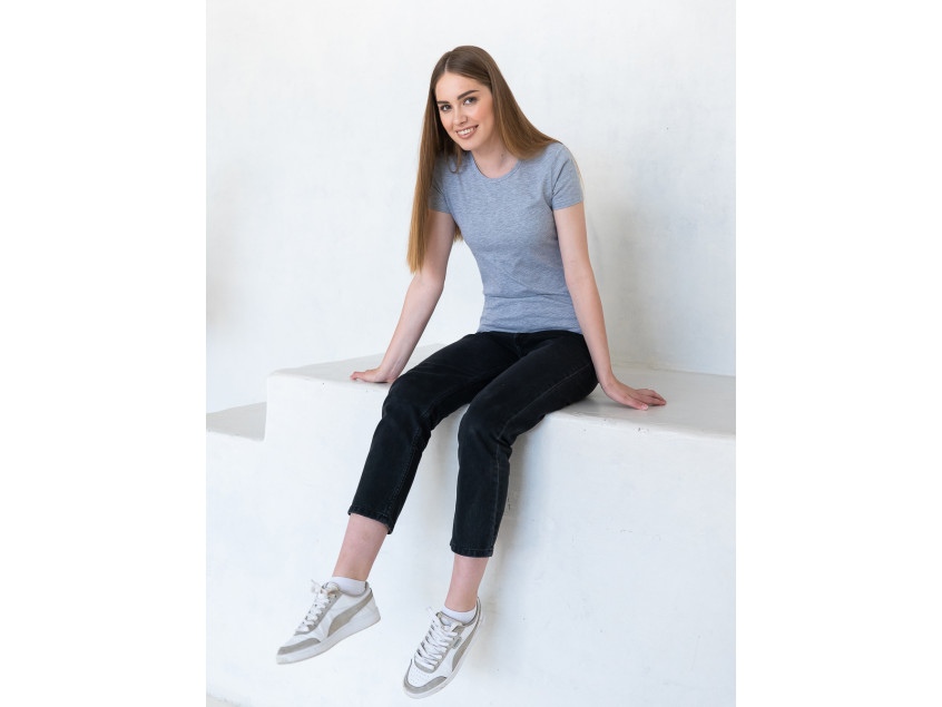 Женская футболка приталенного силуэта с округлым воротом и втачным рукавом.