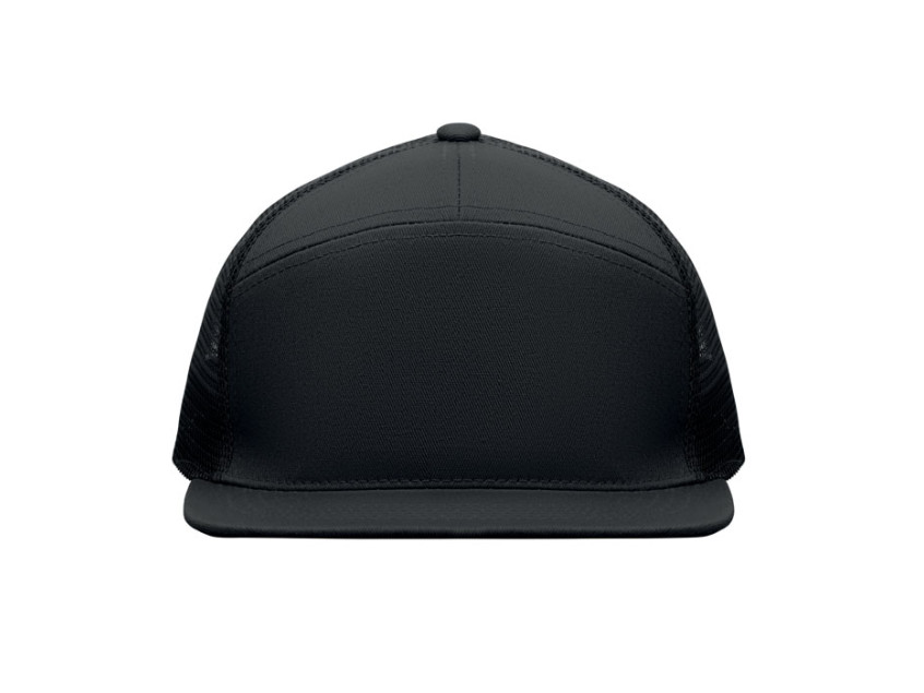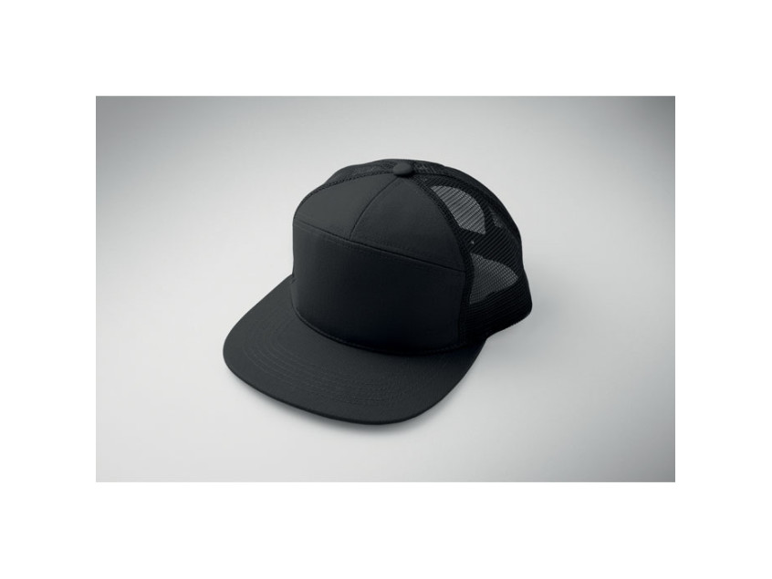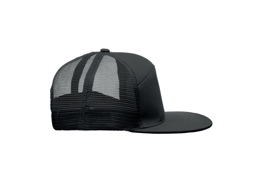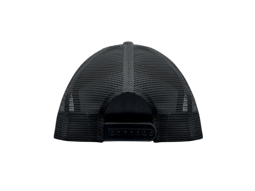Бейсболка с плоским козырьком из хлопка 235 г/м² с сетчатой задней частью из полиэстера и пластиковой застежкой.