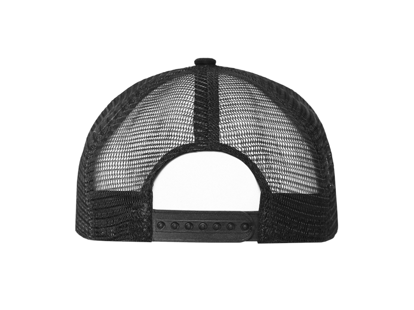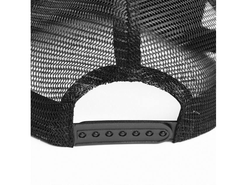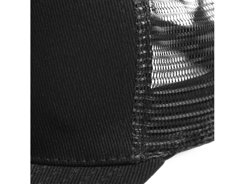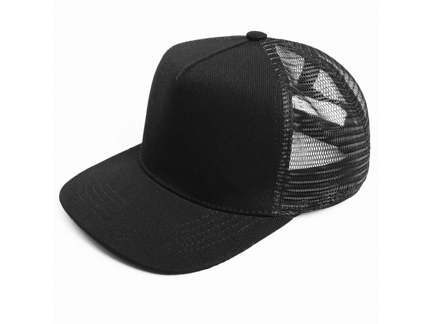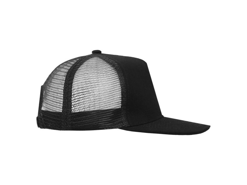 Бейсболка-пятиклинка с прямым жестким козырьком и пластиковой регулируемой застежкой, боковые клинья выполнены из жесткой сетки.
