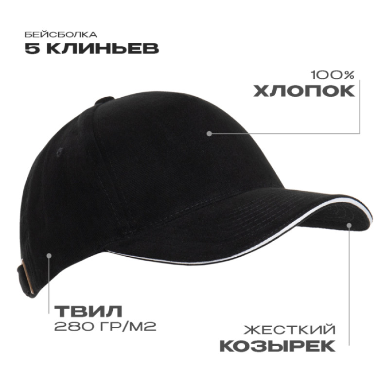 Бейсболка с кантом STAN 5 клиньев хлопок 280, 11K, Чёрный