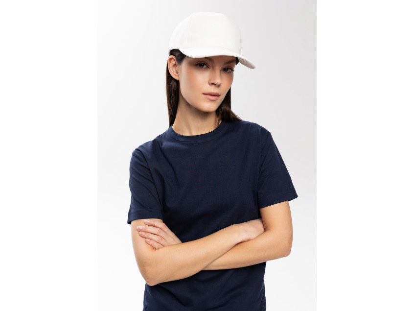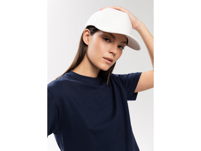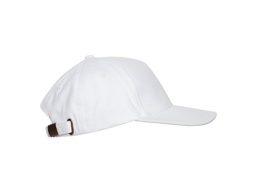 Бейсболка-пятиклинка без лобового шва с изогнутым жестким козырьком. Посадка регулируется ремешком на металлической застежке.