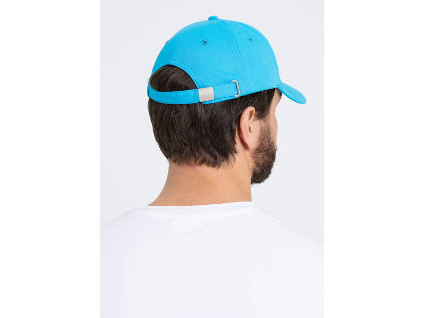 Бейсболка-пятиклинка без лобового шва с изогнутым жестким козырьком. Посадка регулируется ремешком на металлической застежке.
