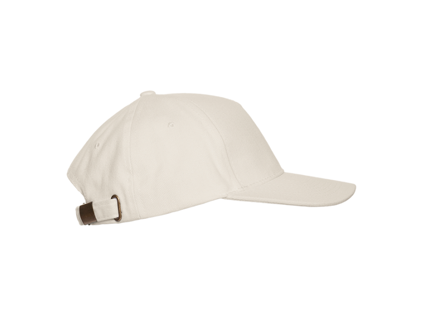 Бейсболка-пятиклинка без лобового шва с изогнутым жестким козырьком. Посадка регулируется ремешком на металлической застежке.