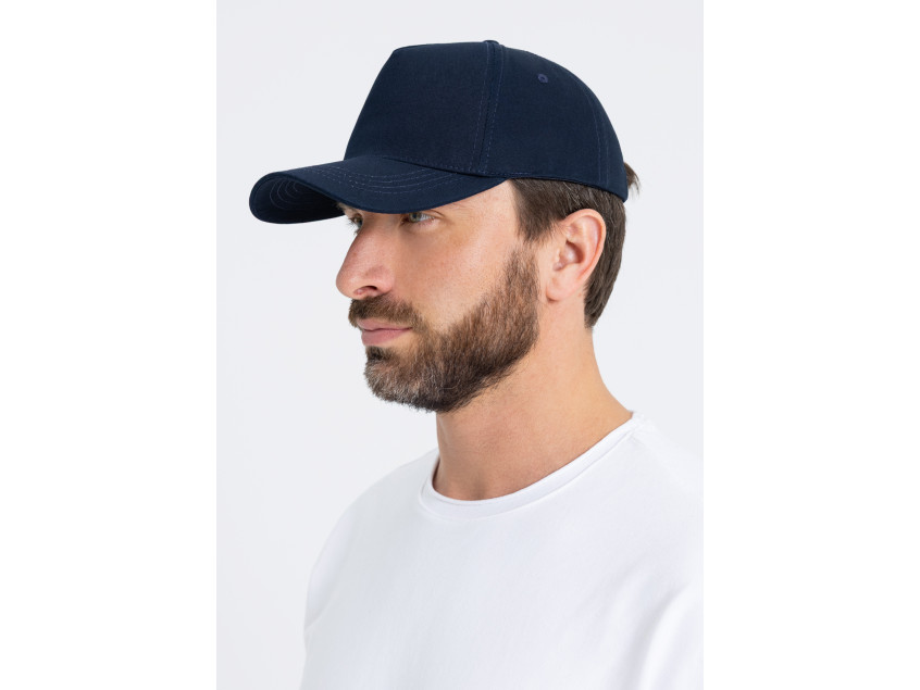 Бейсболка-пятиклинка без лобового шва с изогнутым жестким козырьком. Посадка регулируется ремешком на металлической застежке.