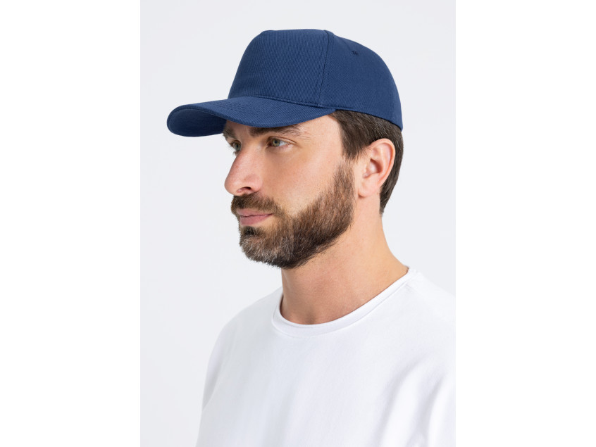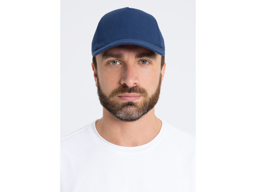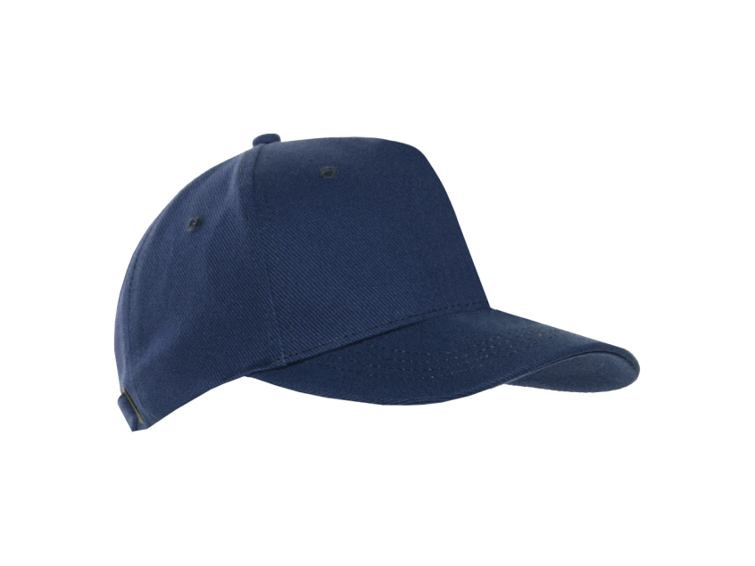 Бейсболка-пятиклинка без лобового шва с изогнутым жестким козырьком и регулируемой металлической застежкой.