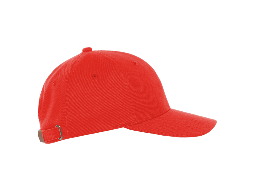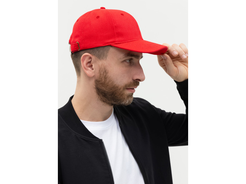 Бейсболка-шестиклинка с изогнутым жестким козырьком, прилегание регулируется ремешком с металлической застежкой.