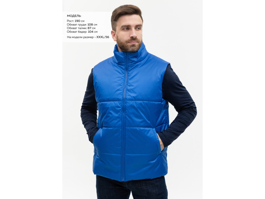 Размер мужского жилета: XXL/54. Параметры модели: рост 190 см.; обхват груди 108 см.; обхват талии 87 см.; обхват бедер 104 см.