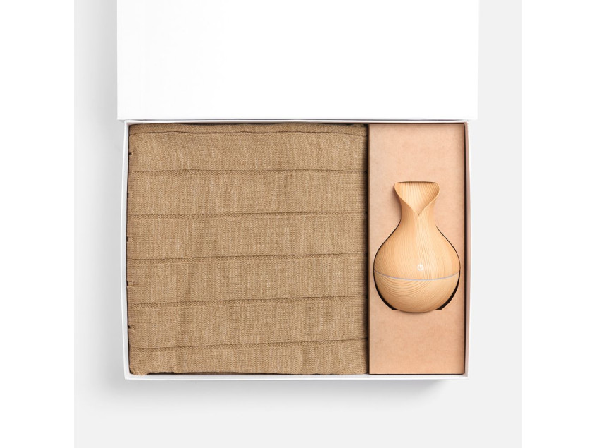 Мягкий плед с приятной текстурой приглашает расслабиться и насладиться теплом, а изящный увлажнитель-ароматизатор создает в помещении атмосферу гармонии.