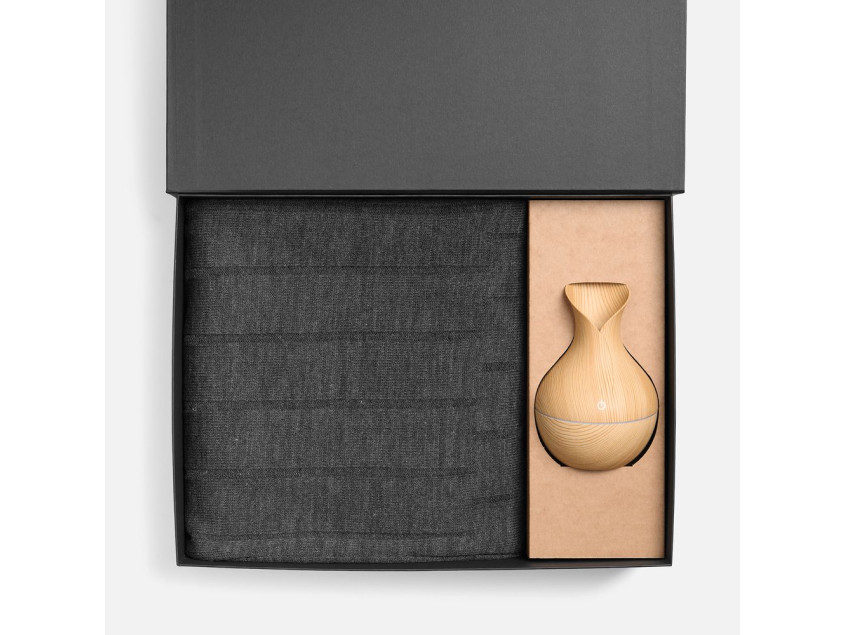 Мягкий плед с приятной текстурой приглашает расслабиться и насладиться теплом, а изящный увлажнитель-ароматизатор создает в помещении атмосферу гармонии.