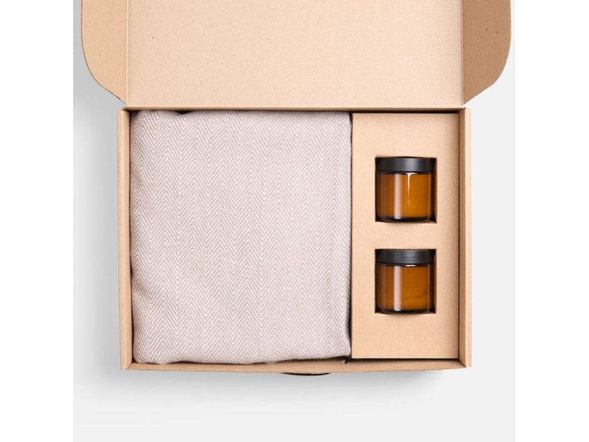 Мягкий плед с нежной бахромой станет идеальным спутником для расслабляющих вечеров и придаст стильный облик любому интерьеру. Две ароматические свечи в элегантных стеклянных баночках мягко наполнят пространство расслабляющим светом и тонким ароматом, добавляя нотки спокойствия и гармонии.