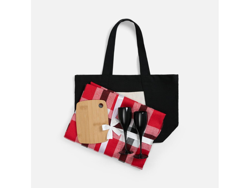 Материал:плед - шерсть 15%; хлопок 5%; полиэстер 60%; акрил 20%, плотность 200 г/м²; шопер - полиэстер 60%, переработанный хлопок 40%, плотность 340 г/м²; бокалы - пластик; доска - бамбук