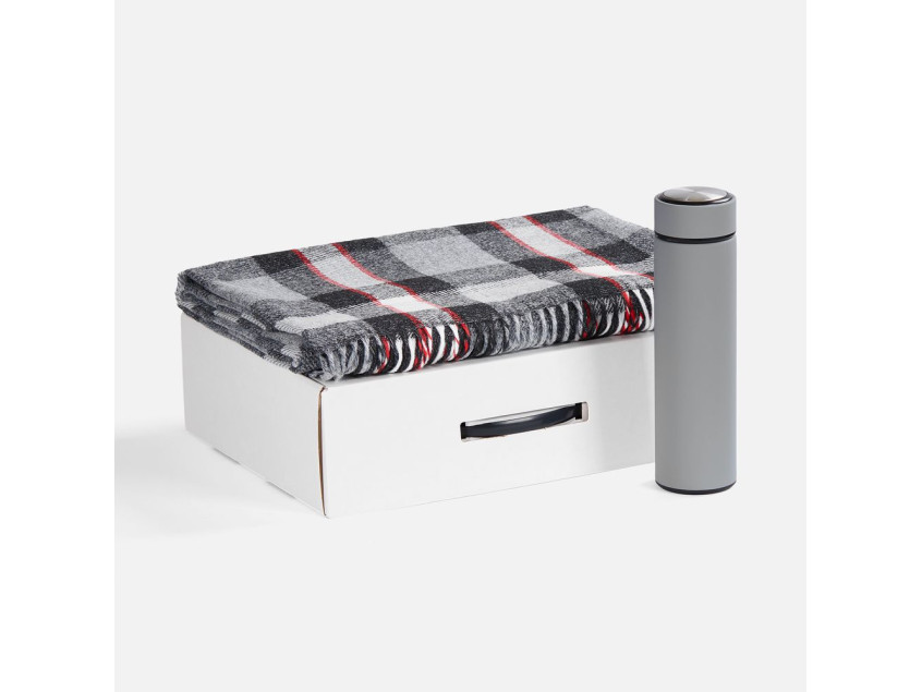 | Материал: | плед - шерсть, 15%; хлопок, 5%; полиэстер 60%; акрил, 20%, плотность 200 г/м²; термос - нержавеющая сталь, 304; покрытие софт-тач; коробка - картон |