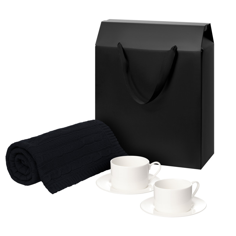 Подарочный набор Mokko, Fado, темно-синий в черной коробке-пакете (две чайных пары, плед)