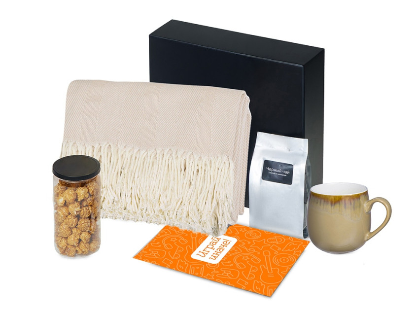 | Материал: | плед - 100% хлопок, кружка - костяной фарфор с покрытием soft-touch,чай - пластик, попкорн - пластик, металл, мешок - нетканый материал (спандонд), коробка - картон |