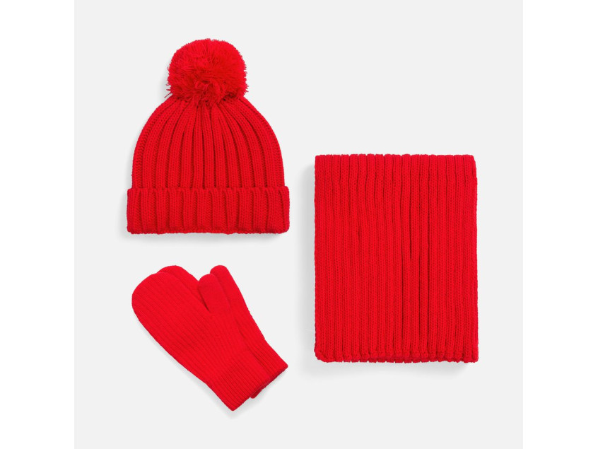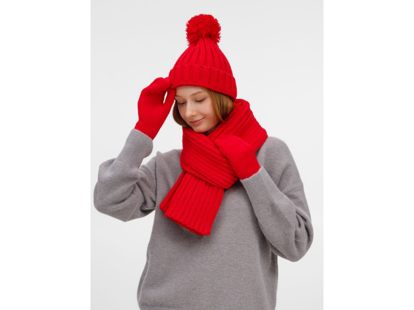 Шапка с пышным помпоном и отворотом, связанная крупной резинкой создает игривый силуэт, а широкий шарф с выразительной текстурой надежно защищает от ветра, сохраняя свободу движений. Варежки с отворотом-резинкой плотно облегают запястье, не пропуская холод.