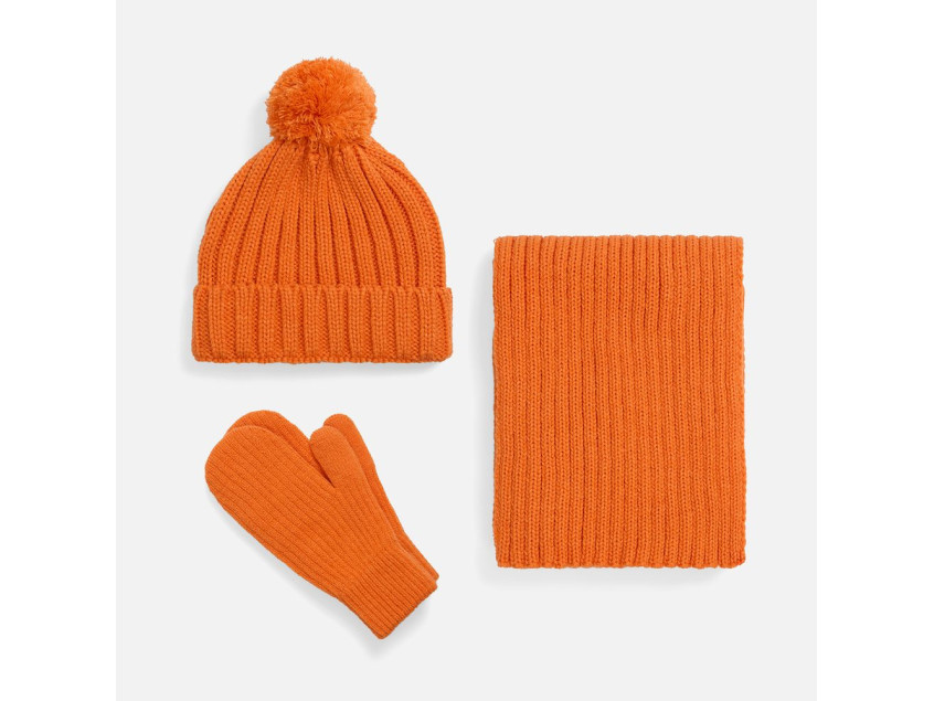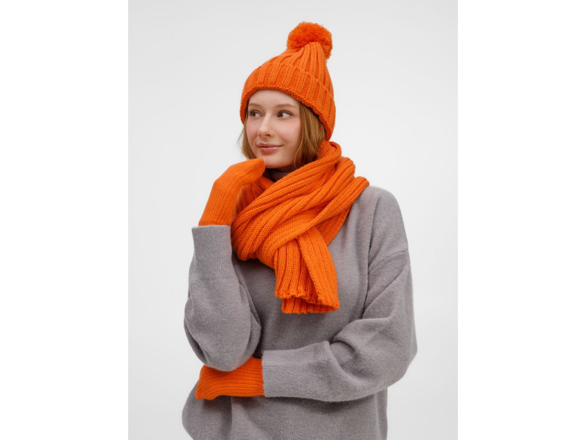 Шапка с пышным помпоном и отворотом, связанная крупной резинкой создает игривый силуэт, а широкий шарф с выразительной текстурой надежно защищает от ветра, сохраняя свободу движений. Варежки с отворотом-резинкой плотно облегают запястье, не пропуская холод.