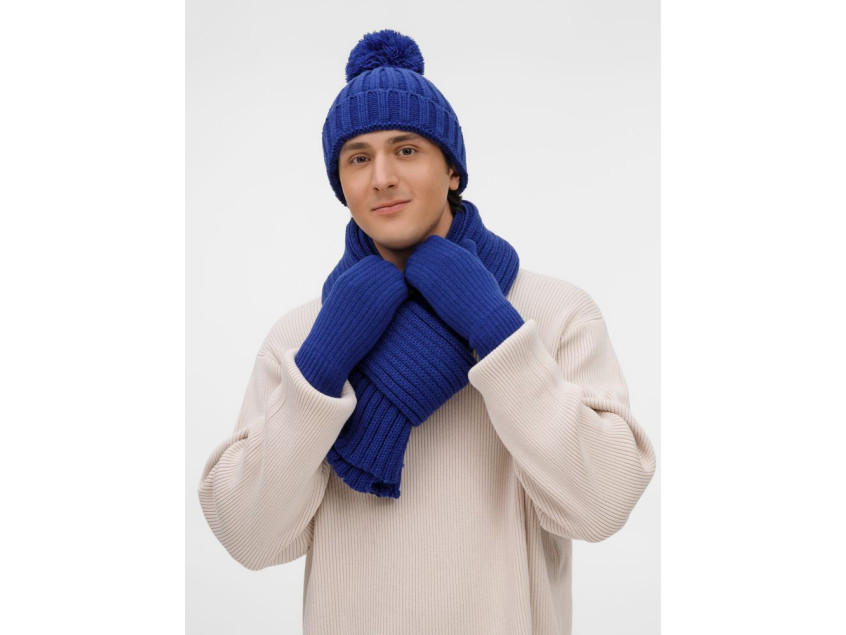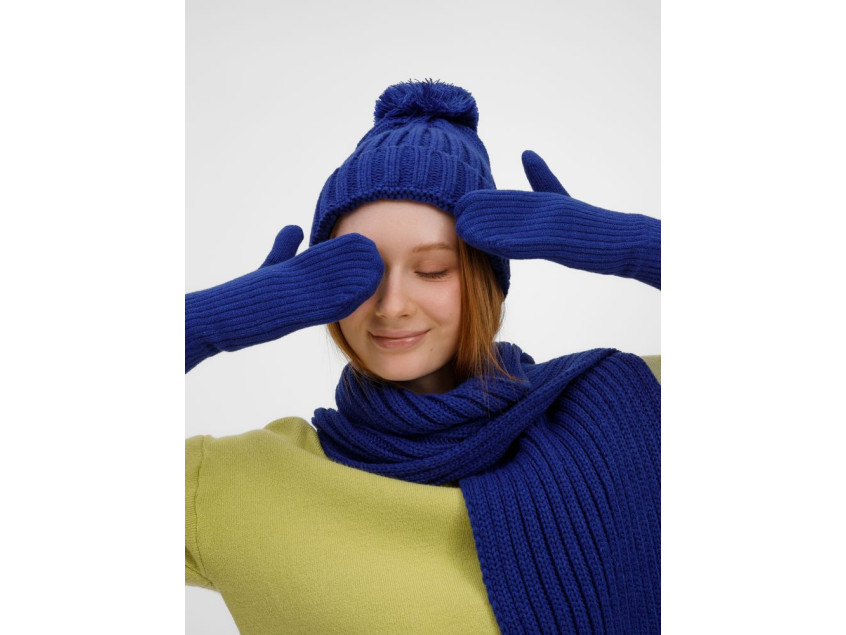 Шапка с пышным помпоном и отворотом, связанная крупной резинкой создает игривый силуэт, а широкий шарф с выразительной текстурой надежно защищает от ветра, сохраняя свободу движений. Варежки с отворотом-резинкой плотно облегают запястье, не пропуская холод.