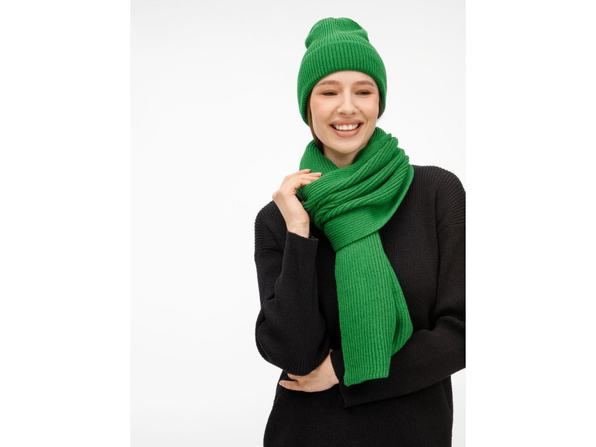 Удлиненная шапка с широким отворотом и фактурной вязкой мягко облегает голову, создавая элегантный силуэт. Широкий шарф с выразительным рельефом позволяет экспериментировать с драпировками, добавляя образу объем и динамику. Перчатки с аккуратной резинкой на манжете обеспечивают идеальную посадку и тактильный комфорт.