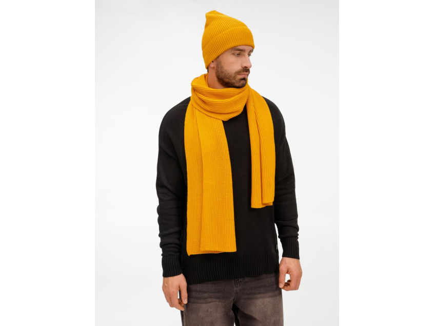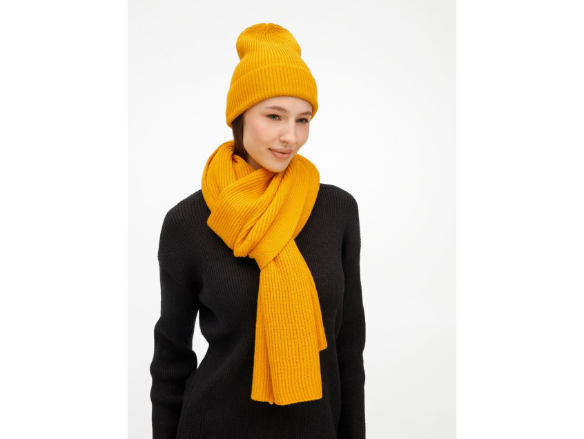 Удлиненная шапка с широким отворотом и фактурной вязкой мягко облегает голову, создавая элегантный силуэт. Широкий шарф с выразительным рельефом позволяет экспериментировать с драпировками, добавляя образу объем и динамику. Перчатки с аккуратной резинкой на манжете обеспечивают идеальную посадку и тактильный комфорт.