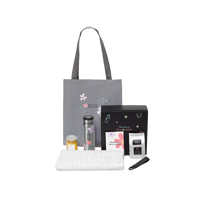 Подарочный набор Re:f. Walk — о прогулках, которые дарят тепло и удовольствие. Мягкий палантин согреет в прохладный день, а термос с ароматным чаем сделает любую паузу приятной и уютной. В шопере удобно носить с собой все необходимое, а манго добавляет сладкую нотку радости и солнца. Этот набор напоминает: даже обычная прогулка может стать временем для себя, наполненным комфортом и маленькими удовольствиями.