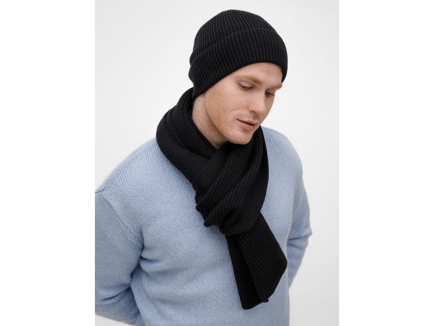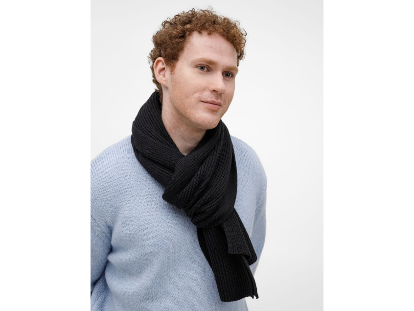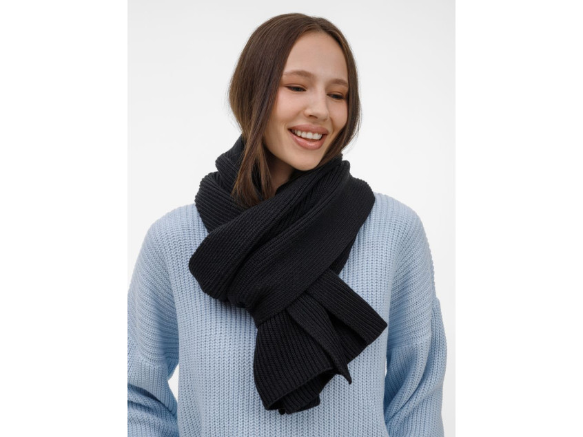 Широкий шарф из мягкой полушерстяной пряжи с выразительной фактурной вязкой создает современный запоминающийся образ.