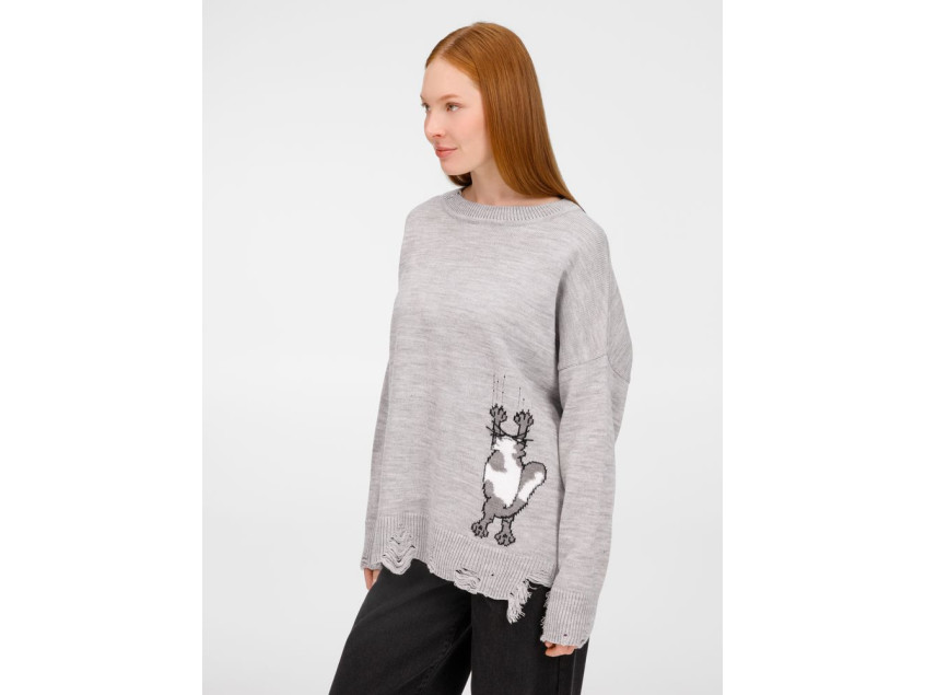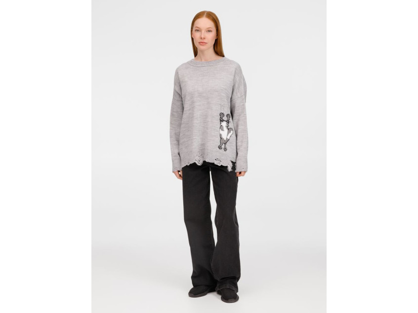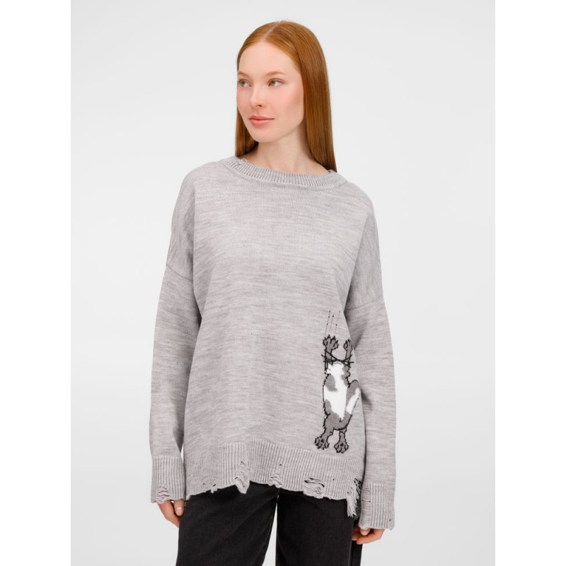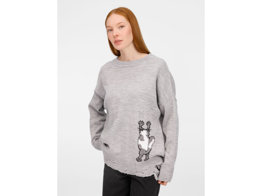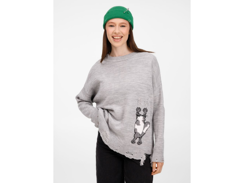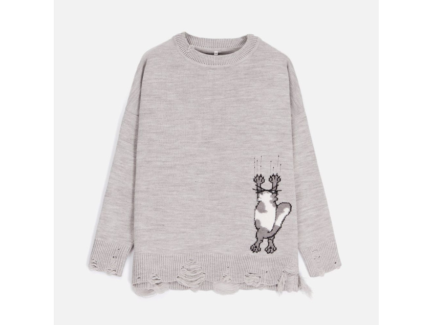 Мягкий джемпер с круглым вырезом и милым пушистым рисунком в виде котика создает настроение легкой несерьезности. Рваные края изделия добавляют современную нотку, а резинка на вороте, манжетах и по низу обеспечивает удобную посадку. Джемпер Sharpick — идеальный выбор для тех, кто ценит комфорт и хочет разнообразить свой гардероб.