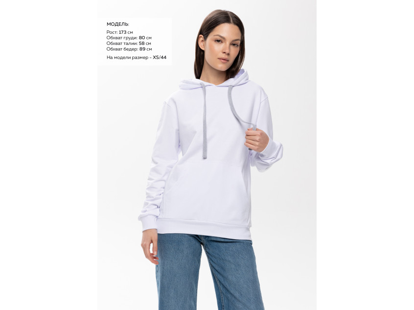 Размер женского худи: XS/44. Параметры модели: рост 173 см.; обхват груди 80 см.; обхват талии 58 см.; обхват бедер 89 см.
