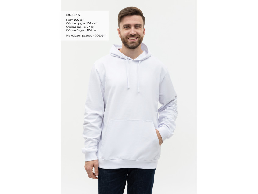 Размер мужского худи: XXL/54. Параметры модели: рост 190 см.; обхват груди 108 см.; обхват талии 87 см.; обхват бедер 104 см.