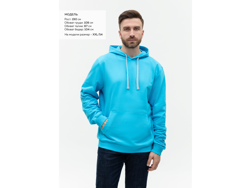 Размер мужского худи: XXL/54. Параметры модели: рост 190 см.; обхват груди 108 см.; обхват талии 87 см.; обхват бедер 104 см.
