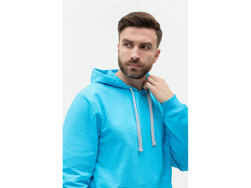 Толстовка прямого силуэта с капюшоном, втачным рукавом и карманом-кенгуру. Капюшон дополнен шнурком для регулирования прилегания, манжет и низ изделия оформлены широкой эластичной резинкой. Возможно два варианта исполнения: контрастные шнурок и бейка/шнурок и бейка в цвет толстовки.