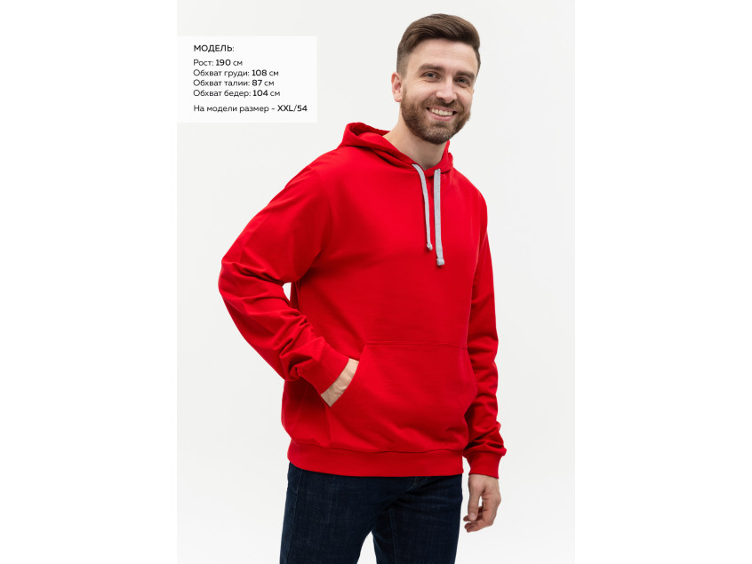 Размер мужского худи: XXL/54. Параметры модели: рост 190 см.; обхват груди 108 см.; обхват талии 87 см.; обхват бедер 104 см.
