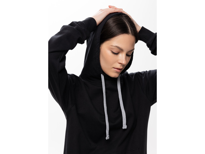Толстовка прямого силуэта с капюшоном, втачным рукавом и карманом-кенгуру. Капюшон дополнен шнурком для регулирования прилегания, манжет и низ изделия оформлены широкой эластичной резинкой. Возможно два варианта исполнения: контрастные шнурок и бейка/шнурок и бейка в цвет толстовки.